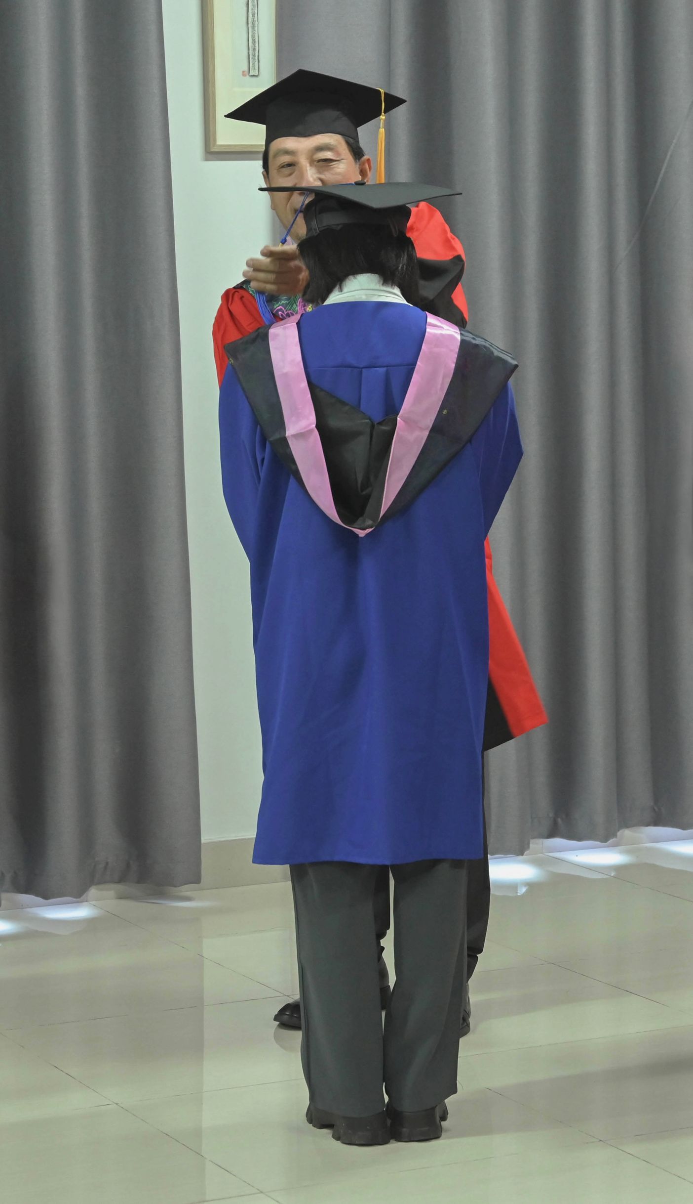 会议现场,毕业生依次上台,院长李宪锋为毕业生拨穗,颁发学位证书,与会教师和毕业生合影留念,一同见证和分享这光荣而神圣的人生重要时刻。