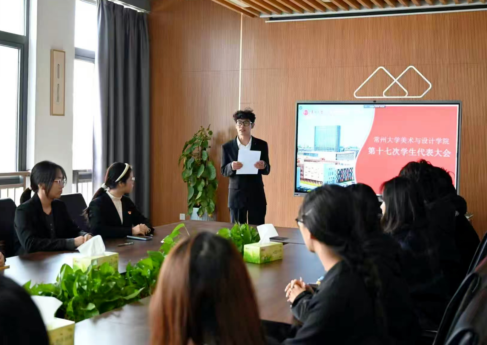 常州大学美术与设计学院于2025年11月3日上午,在立行楼四楼会议室召开第十七次学生代表大会,院团委副书记王维琳、院学生会主席团及各年级本科生代表参会。