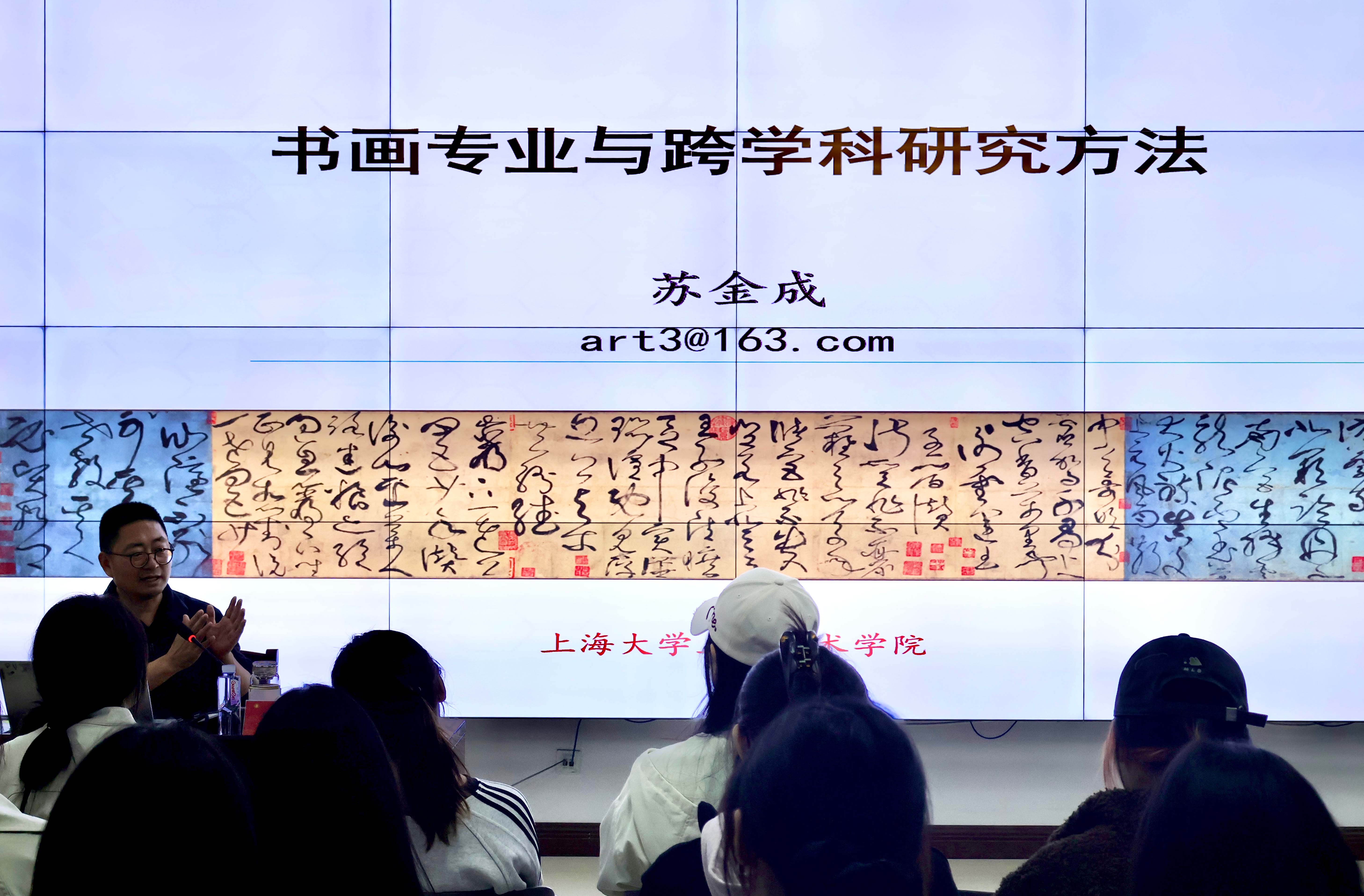 11月10日下午,我院特邀上海大学上海美术学院教授、博士生导师苏金成在立行楼121报告厅作了题为《书画专业与跨学科研究方法》的学术讲座。讲座由副院长(主持工作)贾韬主持,吸引了众多师生到场聆听。
