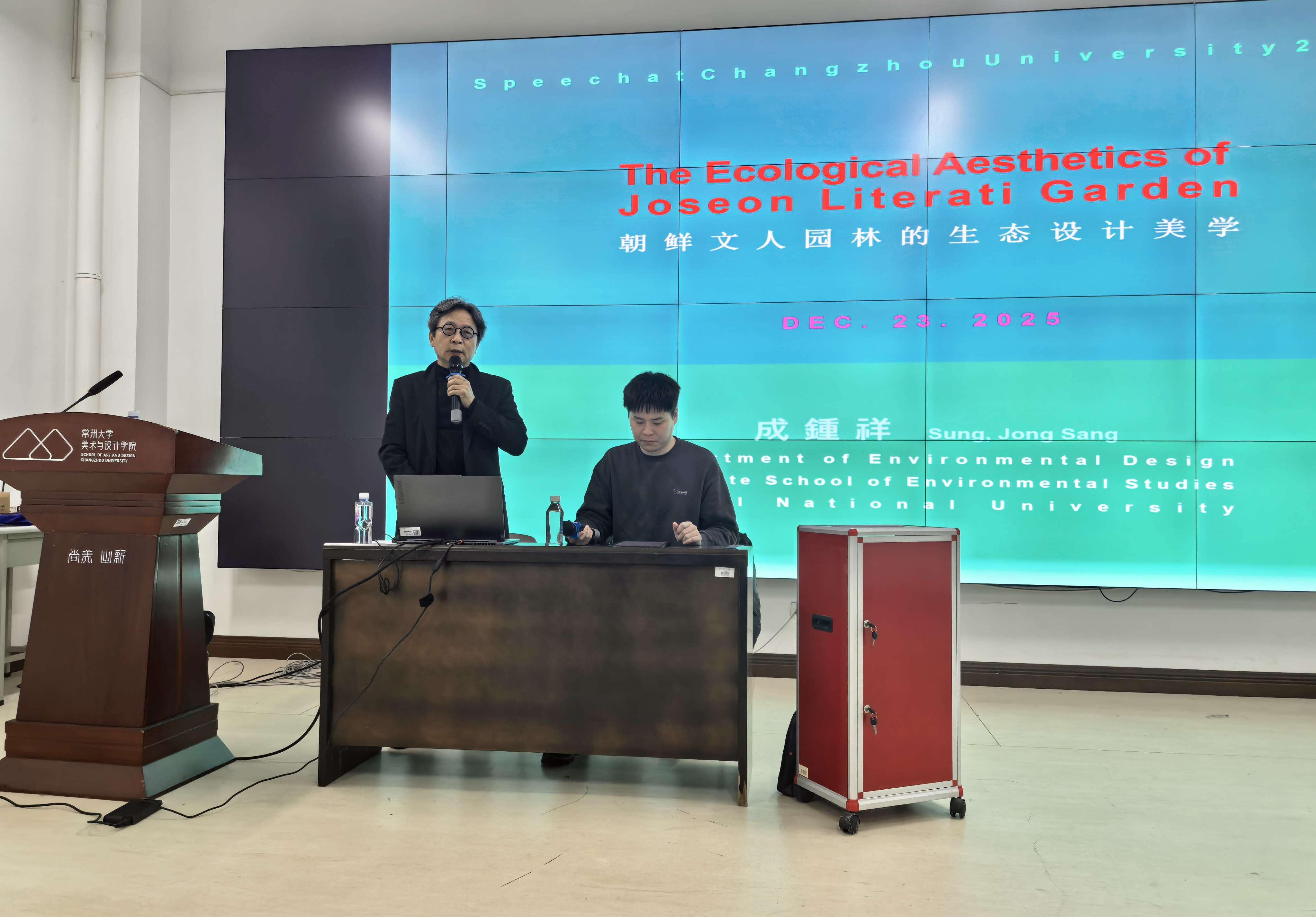 12月23日下午,我院特邀首尔国立大学环境学院院长、博士生导师成锺祥(Jongsang Sung, Ph.D.)教授,在西太湖校区立行楼121开展《朝鲜文人之别墅庭园生态美学》学术讲座。学院相关专业教师及环境设计方向学生参加了本次讲座,讲座由副院长王堞凡主持。