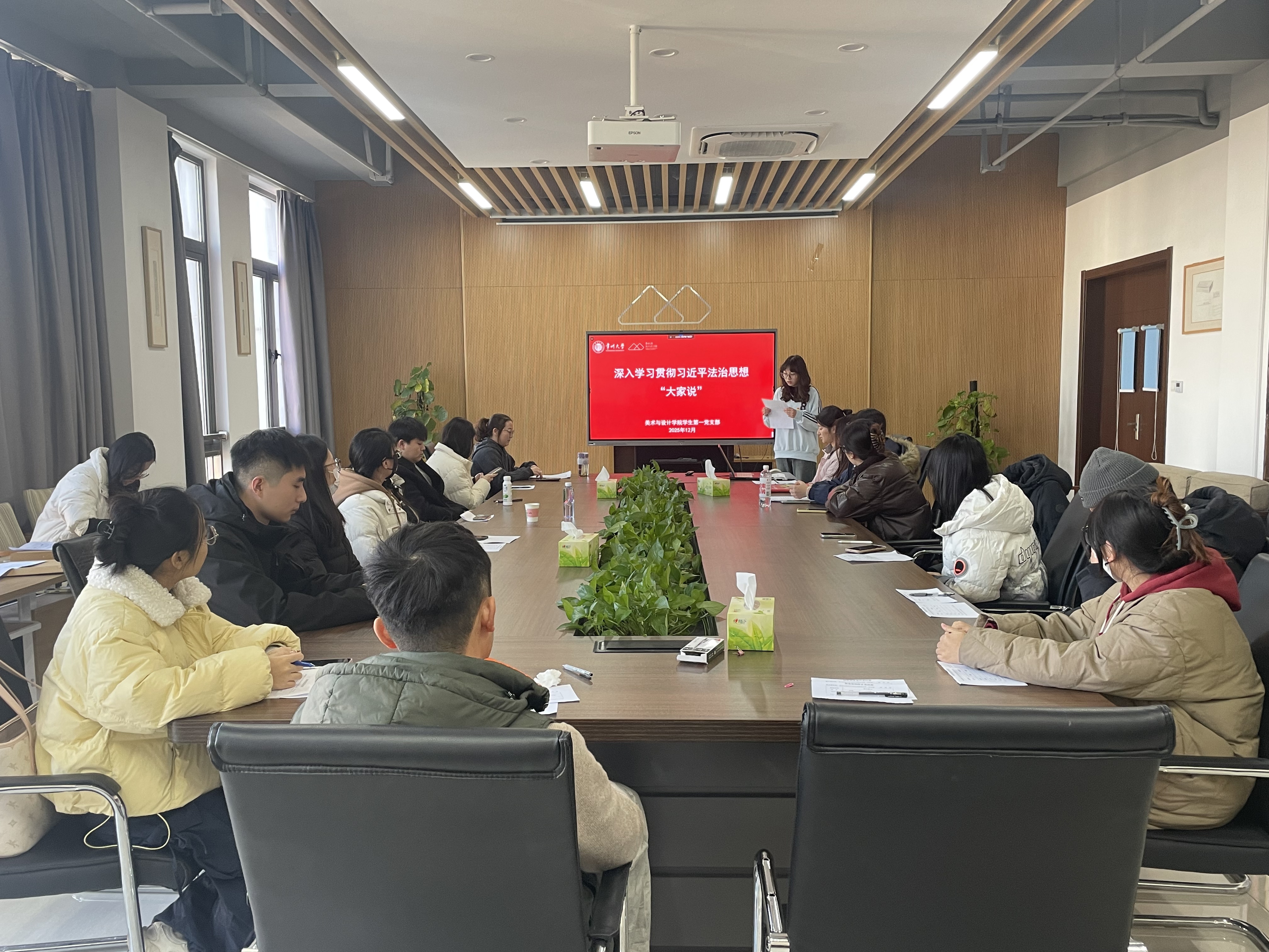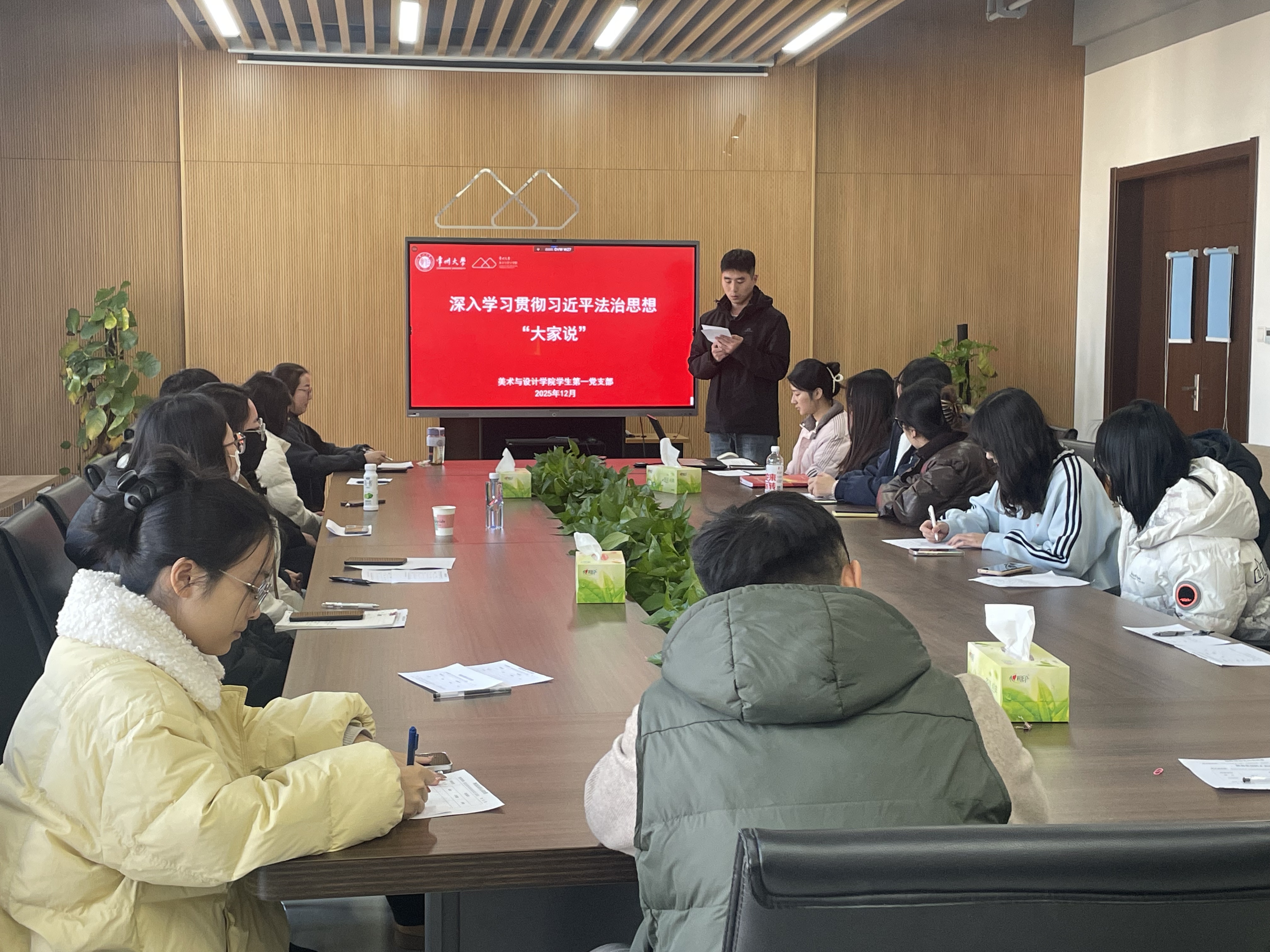 为深入学习贯彻习近平法治思想,推动法治精神与艺术创作实践有机融合,12月22日下午,美术与设计学院学生第一党支部组织开展“习近平法治思想‘大家说’”主题党日活动。