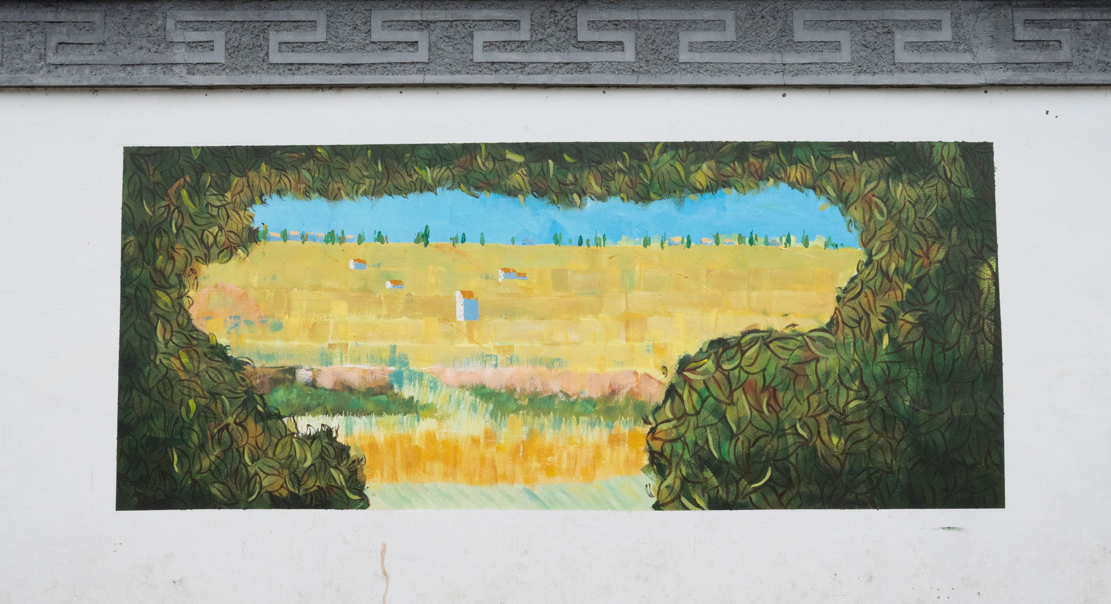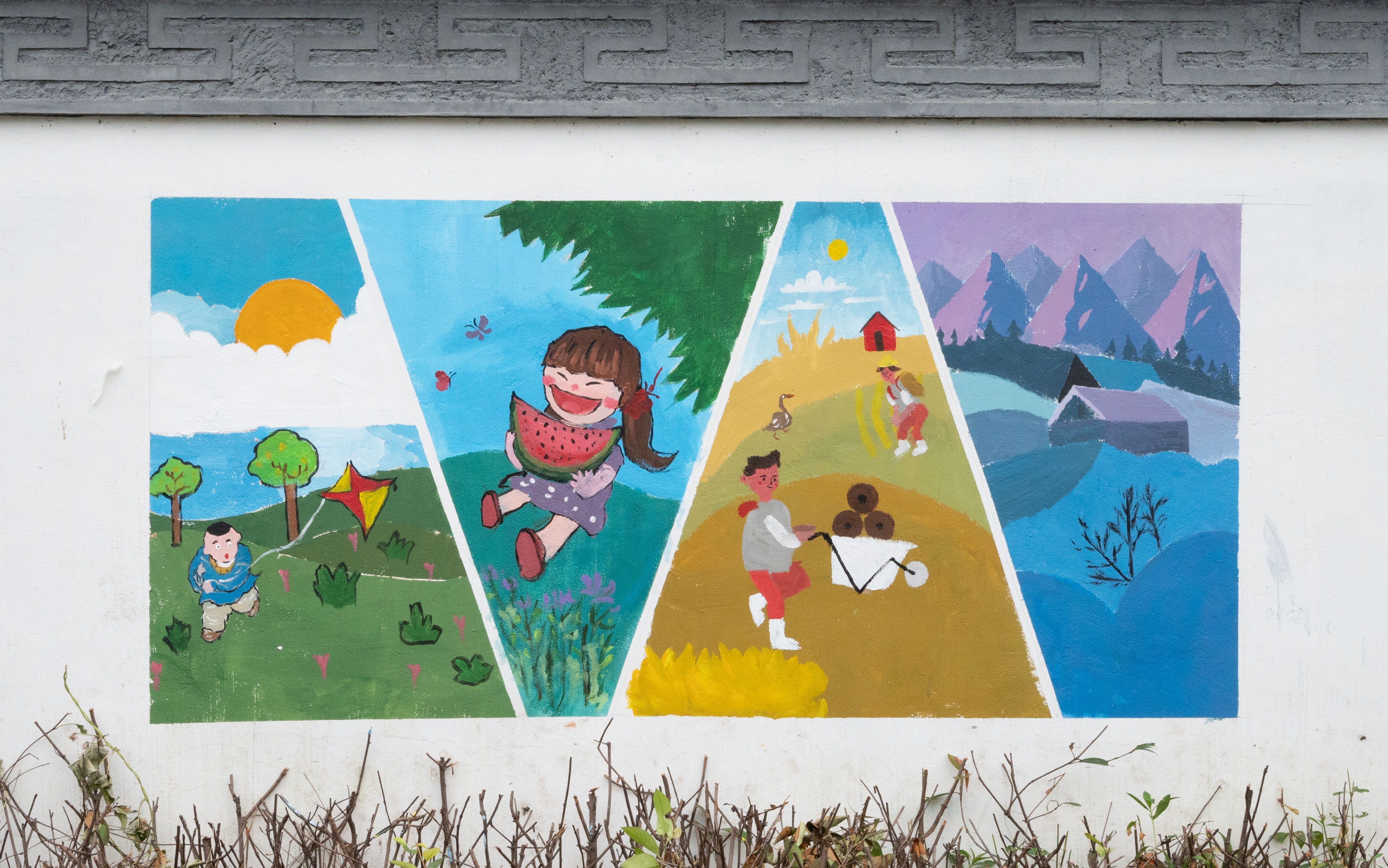 建春村是一个以传统农业生产为主的鱼米之乡。美院社会实践团队通过多次实地勘察,研究确定了实践方案,并与实践地单位进行沟通后,策划了以“田园农耕”为主题的公益墙绘创作。通过《四季》、《生态》、《秋收》、《灯火可亲》等八幅寓意鲜明、色彩亮丽的巨大幅墙绘作品,聚焦新农村人民的美好生活,展现乡村振兴战略带来的幸福成果。