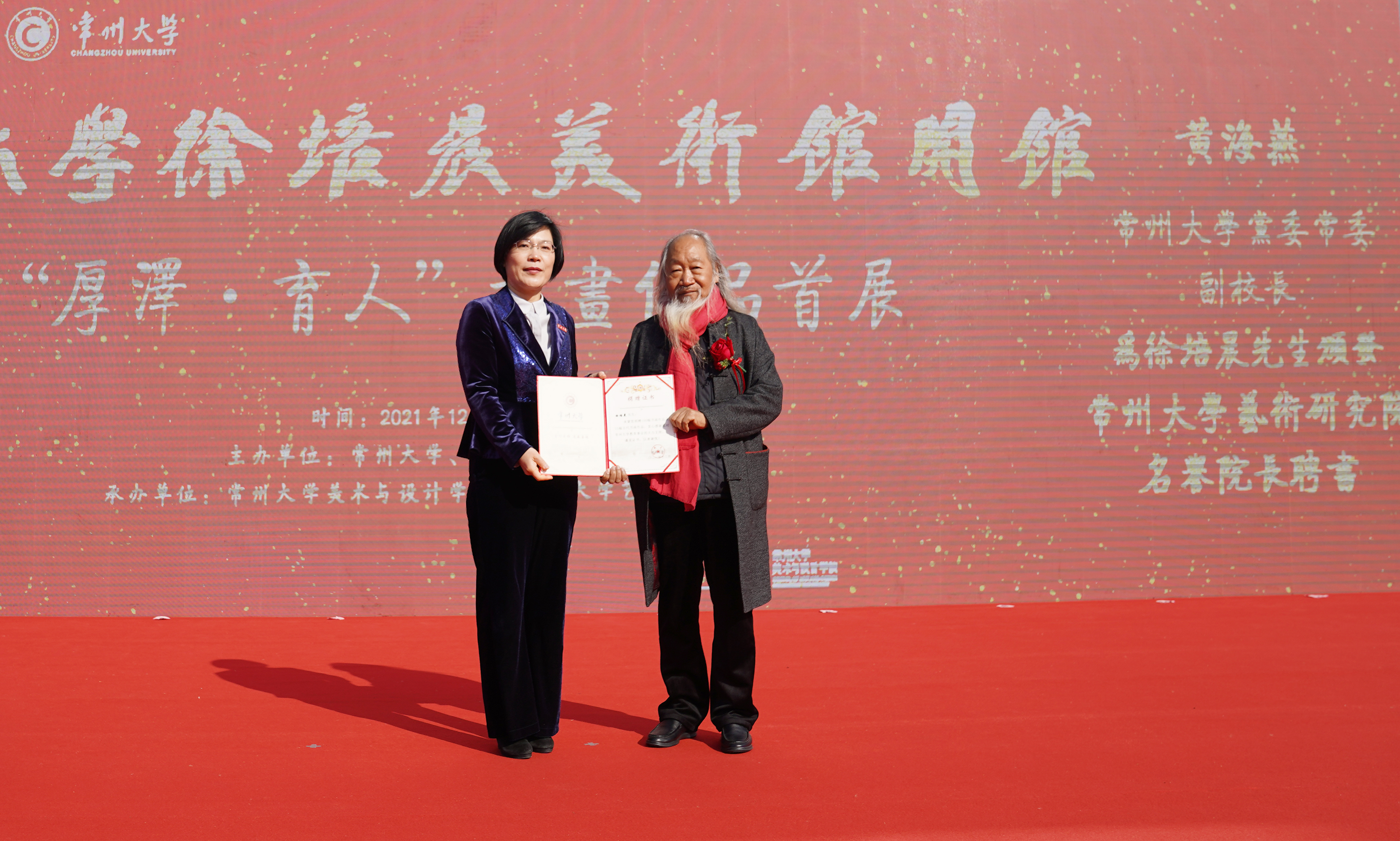 黄海燕为徐培晨先生颁发捐赠证书和常州大学艺术研究院名誉院长聘书。与会领导共同为常州大学徐培晨美术馆揭牌。
